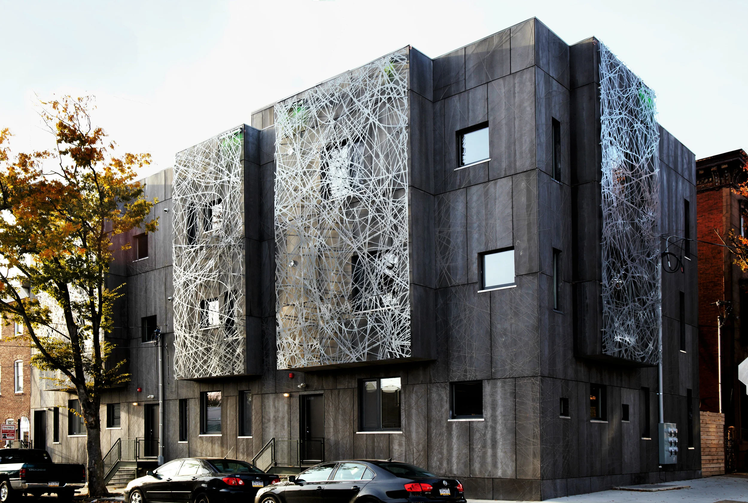 LightWeb is the name of the particular mural shown below, and it was fabricated entirely with steel. Slight variations in the machining process were used to play with reflections of light off the cut steel. Altogether, the architectural design was inspired by local organic growth systems.
